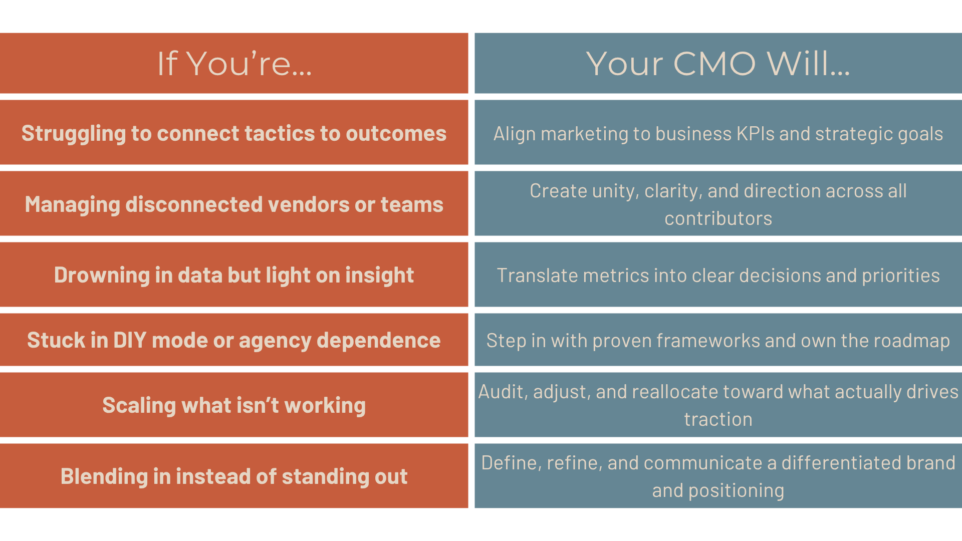 Think of it as gaining CMO-level leadership, scoped to your needs today, built to grow with you tomorrow.